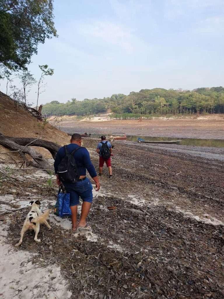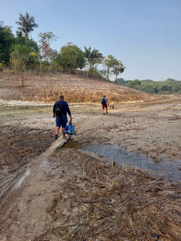 Caminhada de 1h partindo de um ponto denominado “Sem Terra” até a Escola Municipal Canaã II na “Comunidade Julião” , Rio Negro, Tarumã Mirim. Esses professores estão caminhando pelo leito do rio na época da seca. ( imagens de outubro de 2023).